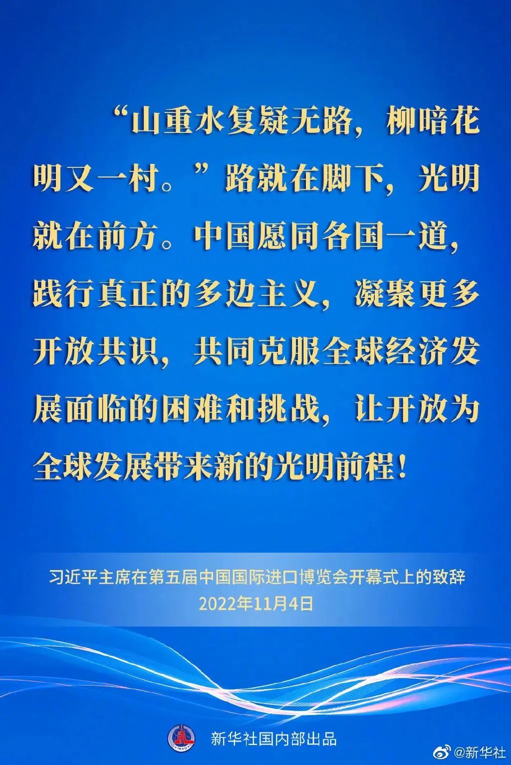 習近平最后強調,路就在腳下,光明就在前方。中國愿同各國一道,踐行真正的多邊主義,凝聚更多開放共識,共同克服全球經濟發展面臨的困難和挑戰,讓開放為全球發展帶來新的光明前程!