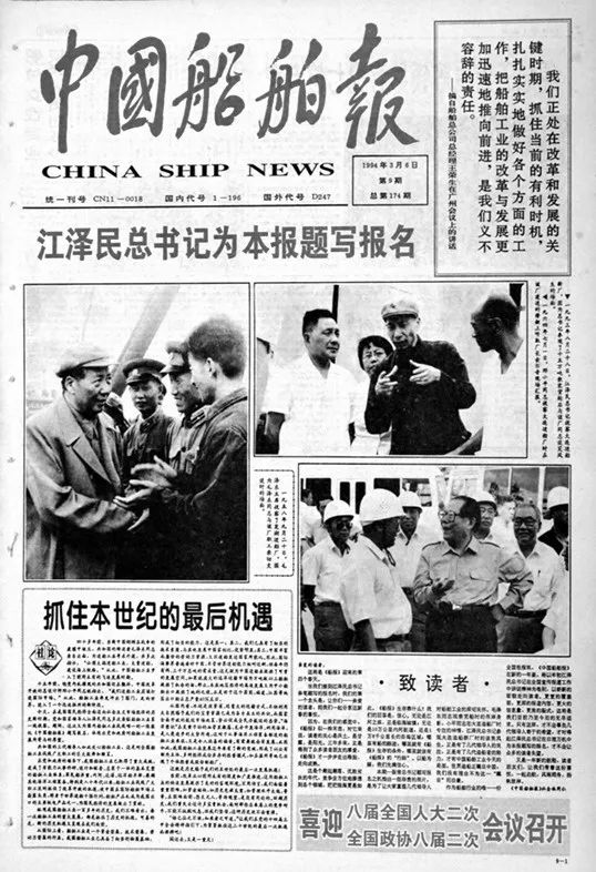 1994年3月6日,《中國船舶報》首次啟用江澤民同志親筆題寫的報頭。