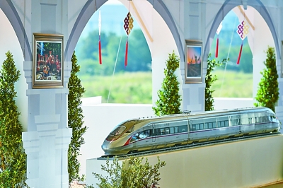 在開工儀式上展出的中國“復興號”高鐵列車模型。新華社發
