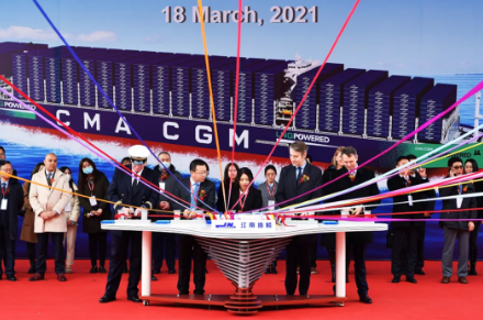 2020年12月22日,江南造船為達飛集團建造的23000TEU超大型雙燃料集裝箱船“達飛·盧浮宮”號正式命名交付。