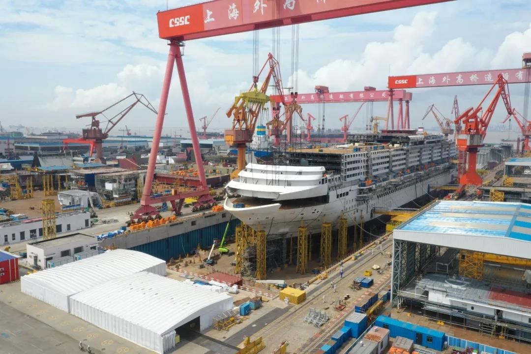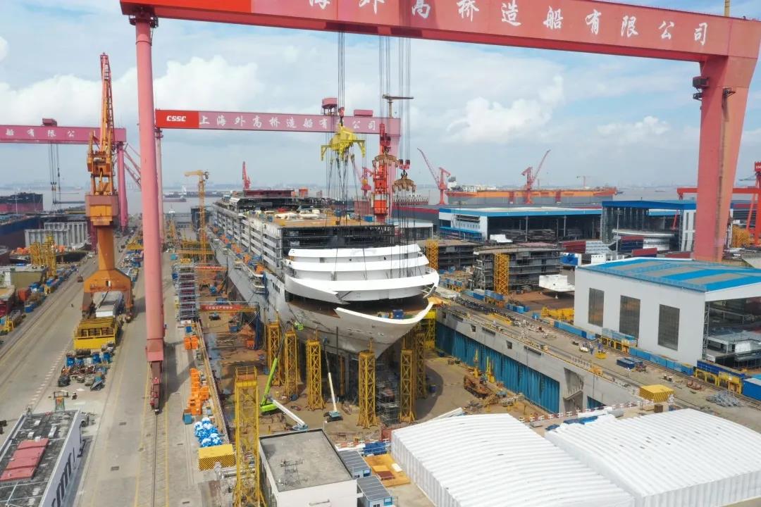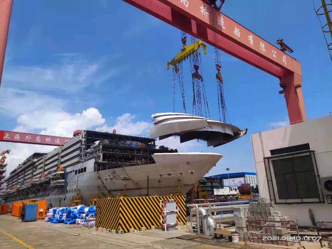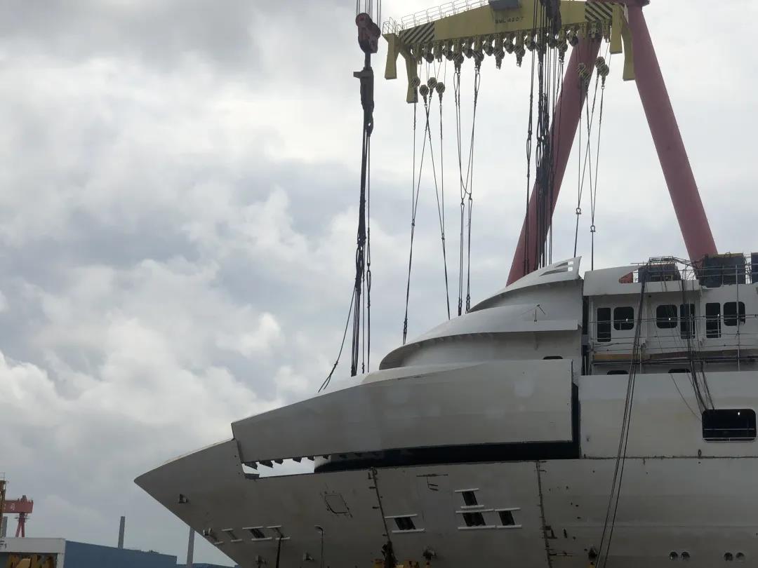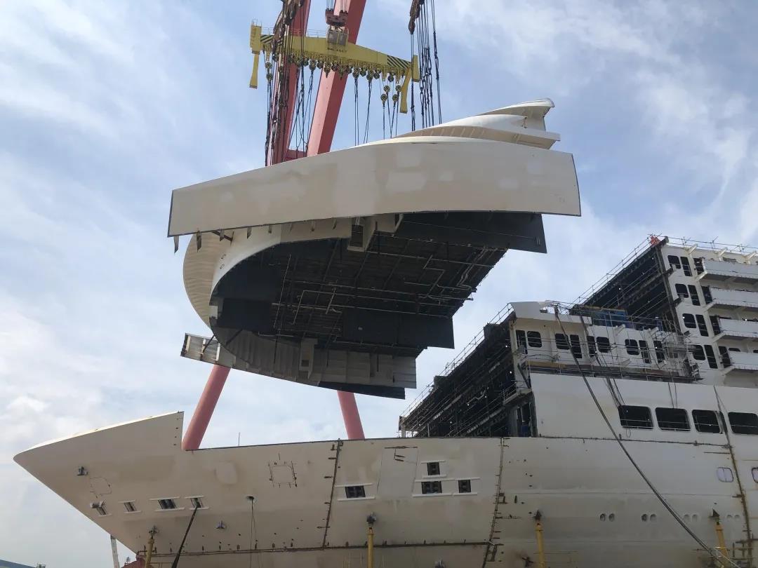 國(guó)產(chǎn)首制大型郵輪完成首個(gè)艏部總段吊裝! 預(yù)計(jì)9月實(shí)現(xiàn)全船結(jié)構(gòu)貫通。