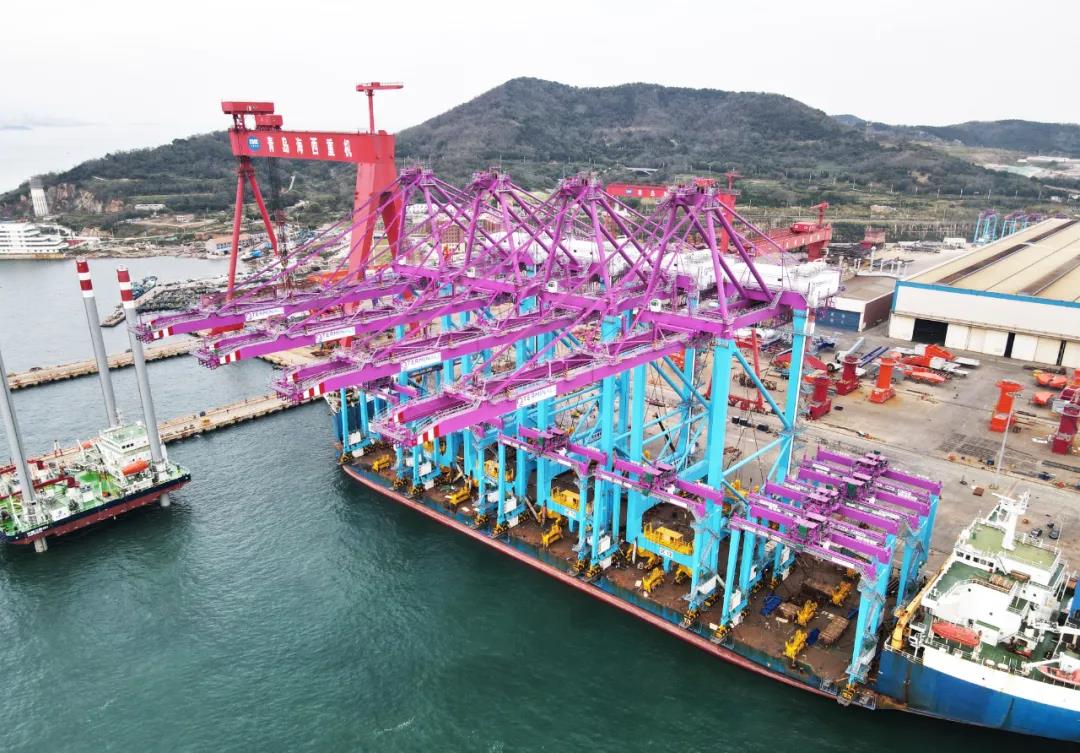 近日,武漢船機海西重機為卡塔爾哈馬德新港二期打造的4臺岸橋、10臺輪胎起重機從青島西海岸新區(qū)啟運。