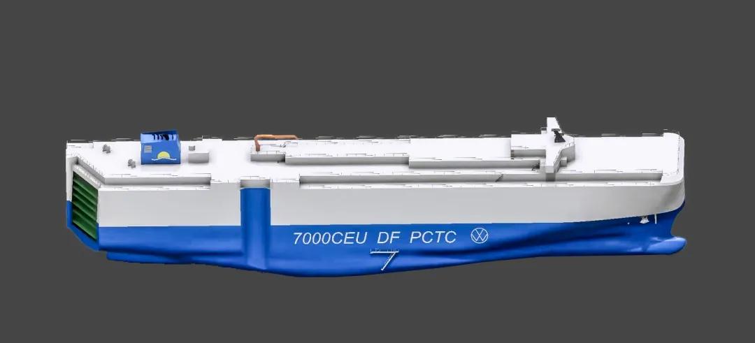 該型船可裝載7000輛汽車,采用先進的天然氣(LNG)/燃油雙燃料推進系統(tǒng)設計,可在3種燃料模式下航行,續(xù)航力最高可達15,000海里。配置了高壓岸電系統(tǒng),采取了減阻防污漆等各類節(jié)能措施,EEDI(能效營運指標)滿足國際海事組織最新的第二階段(phaseⅡ)要求,是一艘節(jié)能環(huán)保高效的汽車運輸船。