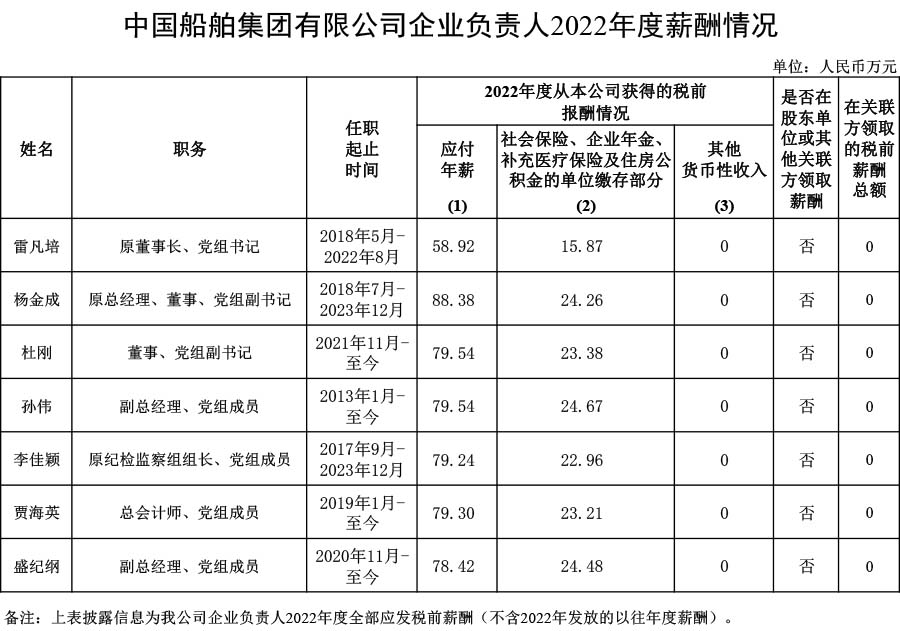 中國(guó)船舶集團(tuán)有限公司企業(yè)負(fù)責(zé)人2022年度薪酬情況