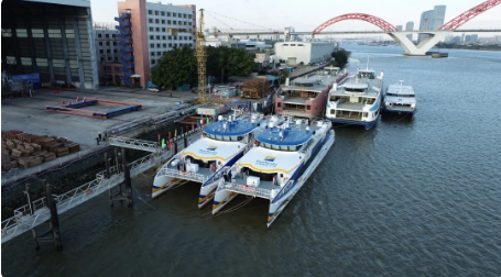 2020年12月30日,中國船舶集團旗下遠舟公司所屬英輝南方造船(廣州番禺)有限公司建造的“新海韻”號、“新海駿”號兩艘鋁合金雙體高速客船,同時在廣州市番禺區英輝南方碼頭順利交付?!靶潞m崱?、“新海駿”是英輝南方為船東建造的藍色干線系列高速客船的第8和第9艘,船長42.8米,寬10.3米,載客199人,設計航速35節。遠舟公司所屬英輝南方在鋁合金高速客船第三代船型基礎上,開展技術創新和船型優化,開發完成了“新海韻”、“新海駿”為代表的第四代新船型。