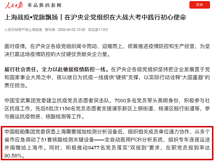 “中國船舶集團黨組獲悉上海需要增加檢測分析設(shè)備后,組織相關(guān)成員單位通力協(xié)作,從多個省市應(yīng)急調(diào)動了51套核酸檢測關(guān)鍵設(shè)備——全自動醫(yī)用PCR分析系統(tǒng),組織專車連夜運送并捐贈給上海市。同時,積極推動9477名黨員落實‘雙報到’要求,在職黨員報到率達90.58%。”