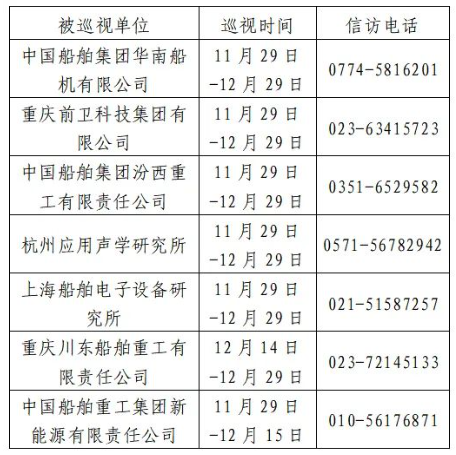 根據(jù)中國船舶集團黨組2023年第二輪巡視工作部署,截至2023年11月29日,巡視工作已經(jīng)鋪開。其中,對中國船舶集團華南船機有限公司、重慶前衛(wèi)科技集團有限公司、中國船舶集團汾西重工有限責任公司、杭州應(yīng)用聲學研究所、上海船舶電子設(shè)備研究所等5家單位開展常規(guī)巡視,對重慶川東船舶重工有限責任公司、中國船舶重工集團新能源有限責任公司等2家單位開展專項巡視。